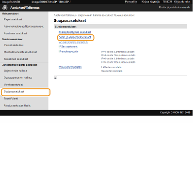 Avainparia ei voi poistaa, jos se on käytössä, esimerkiksi kun "TLS" tai "IEEE 802.1X" näytetään kohdassa [Avaimen käyttö]. Poista tässä tapauksessa toiminto käytöstä tai vaihda avainpari ennen sen poistamista.