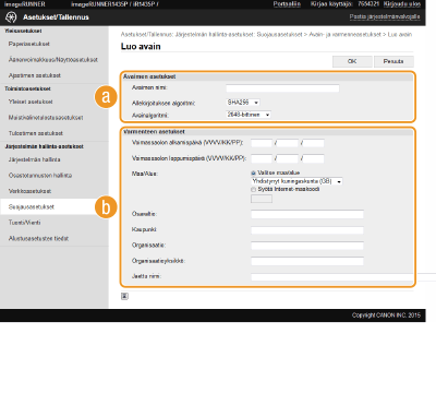 Avainpari voidaan luoda laitteen avulla, kun sitä vaaditaan salattuun TLS (Transport Layer Security) -tiedonsiirtoon. Voit käyttää TLS-salausta, kun käytät laitetta etäkäyttöliittymällä. Enintään viisi avainparia voidaan tallentaa.
