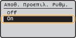 Αφού αποθηκευτεί η προεπιλεγμένη ρύθμιση χαρτιού, η οθόνη ρυθμίσεων χαρτιού δεν εμφανίζεται όταν τοποθετείται χαρτί (χρησιμοποιείται πάντα η ίδια ρύθμιση). Εάν τοποθετήσετε διαφορετικό μέγεθος ή τύπο χαρτιού χωρίς να αλλάξετε τις ρυθμίσεις χαρτιού, η συσκευή ενδέχεται να μην εκτυπώνει σωστά. Για να αποφύγετε αυτό το πρόβλημα, απενεργοποιήστε την προεπιλεγμένη ρύθμιση, επιλέγοντας <Off> στο βήμα 3 και κατόπιν τοποθετήστε χαρτί.
