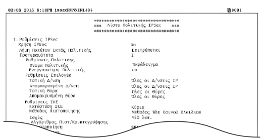 Μπορείτε να εκτυπώσετε μια λίστα για να ελέγξετε τα ονόματα των πολιτικών και των ρυθμίσεων IPSec που είναι αποθηκευμένες την τρέχουσα στιγμή στη συσκευή.