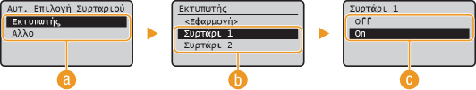 Ενεργοποιήστε ή απενεργοποιήστε τη λειτουργία αυτόματης επιλογής συρταριού για τις πηγές χαρτιού. Εάν η λειτουργία αυτόματης επιλογής συρταριού έχει οριστεί σε <On> κατά την εκτύπωση εγγράφων, επιλέγεται αυτόματα η πηγή χαρτιού που έχει το κατάλληλο μέγεθος χαρτιού. Επίσης, όταν εξαντληθεί το χαρτί, αυτή η ρύθμιση επιτρέπει συνεχή εκτύπωση, αλλάζοντας από μία πηγή χαρτιού σε μια άλλη με το κατάλληλο μέγεθος χαρτιού.