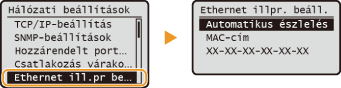 Ha a készüléket kapcsoló hubhoz vagy hídhoz csatlakoztatja, akkor előfordulhat, hogy a helyesen konfigurált IP-cím ellenére csatlakozási hiba lép fel. A probléma úgy hárítható el, hogy beállít egy bizonyos időtartamot, ameddig a készülék nem kezd el kommunikálni. Hálózati csatlakozás előtti várakozási idő beállítása