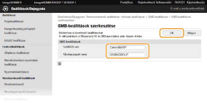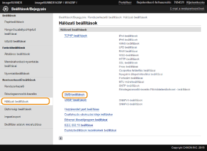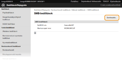 Az SMB (Server Message Block) egy protokoll, amellyel erőforrások, például fájlok és nyomtatók oszthatók meg egy hálózaton több más eszköz között. A készülék SMB használatával jegyez be WINS (Windows Internet Naming Service) kiszolgálót az IP megszerzésére a kiszolgálótól. A hálózattól függően előfordulhat, hogy be kell állítania a NetBIOS nevet és munkacsoportnevet. A WINS konfigurálása