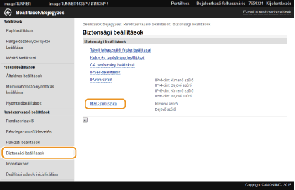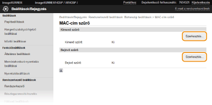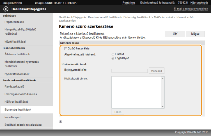 Beviteli hibák ellenőrzése Ha helytelenül adja meg az MAC címeket, akkor előfordulhat, hogy nem fog tudni hozzáférni a készülékhez a Távoli felhasználói felületről, amely esetben a <MAC-cím szűrő> beállítását <Ki> értékre kell állítani. MAC-cím szűrő