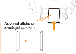 Šajā sadaļā aprakstīta aplokšņu ievietošana pareizajā orientācijā un virzienā un procedūras, kas jāveic pirms aplokšņu ievietošanas. Vispārīgas procedūras aprakstu, kā aploksnes ievietot universālajā paliktnī, skatiet sadaļā Papīra ievietošana universālā paliktnī.