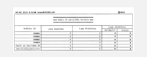 Ja ir iespējota nodaļu ID pārvaldība, varat izdrukāt atskaiti, lai pārbaudītu kopējo drukāto lappušu skaitu katram nodaļas ID. Pārskets ļauj pārraudzīt lietošanu un uzlabot pārvaldību.