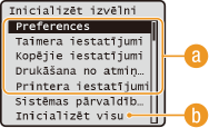 Norādījumus, kā atjaunot iestatījumus kategorijās <Tīkla iestatījumi> un <Sistēmas pārvaldības iestatījumi>, skatiet sadaļā Sistēmas pārvaldības iestatījumu inicializēšana.