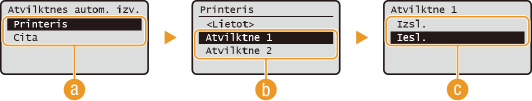 Iespējojiet vai atspējojiet papīra avotu automātiskās atvilktnes atlases funkciju. Ja dokumentu drukāšanas laikā automātiskā atvilktnes izvēle ir iestatīta kā <Iesl.>, iekārta automātiski izvēlas to papīra avotu, kurā ir ievietots atbilstošā formāta papīrs. Ja papīrs beidzas, šis iestatījums aktivizē nepārtrauktu drukāšanu, pārslēdzot no viena papīra avota uz citu tādu avotu, kurā ir ievietots tāda paša formāta papīrs.