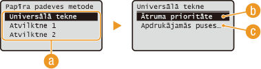 Opcija Universālā tekne> netiek rādīta, ja iepriekšējā ekrānā ir izvēlēta opcija <Printeris> (