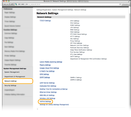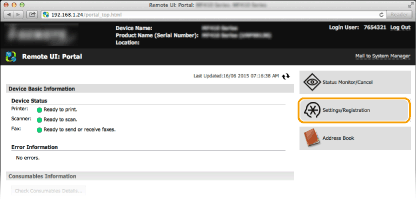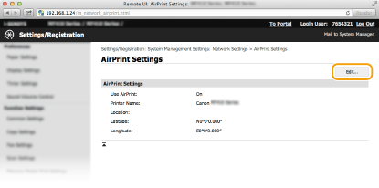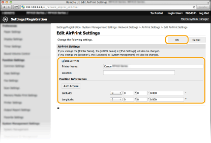 Varat reģistrēt informāciju, tostarp iekārtas nosaukumu un uzstādīšanas vietu, kas tiek izmantota iekārtas identificēšanai. Varat arī atspējot iekārtas AirPrint funkciju. Izmantojiet utilītu Remote UI (Attālais lietotāja interfeiss), lai mainītu šos iestatījumus.