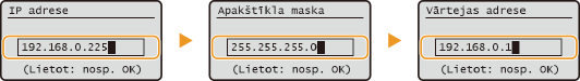 <Apakštīkla maska> <Vārtejas adrese>.Katrā ekrānā ievadiet iestatījumu, izmantojot ciparu taustiņus, un nospiediet
