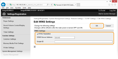 Atzīmējiet izvēles rūtiņu [WINS Resolution], norādiet vajadzīgos iestatījumus un noklikšķiniet uz [OK].