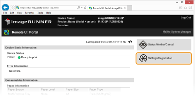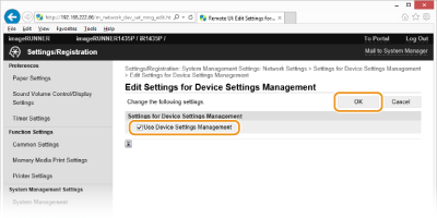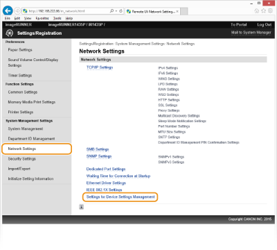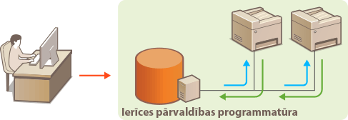 Varat atvieglot dažāda veida informācijas par tīklam pievienotām ierīcēm apkopošanu un pārvaldību, tīklā ieviešot ierīču pārvaldības programmatūru, piem., iW Management Console*. Informācija par, piem., ierīču iestatījumiem un kļūdu žurnāliem, tiek izgūta un izplatīta, izmantojot servera datoru. Ja iekārta ir savienota ar šādu tīklu, ierīču pārvaldības programmatūra to meklē tīklā, izmantojot protokolus, piem., pakalpojuma atrašanas pakalpojumu (Service Location Protocol — SLP), lai apkopotu informāciju par iekārtu. Šajā sadaļā aprakstītas SLP iestatījumu procedūras un iestatījumi sakariem starp iekārtu un iW Management Console spraudņiem. Šos iestatījumus var norādīt, izmantojot utilītprogrammu Remote UI (Attālais lietotāja interfeiss).