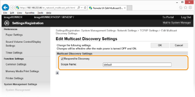 Atzīmējiet šo izvēles rūtiņu, lai iestatītu iekārtu atbildēt uz ierīču pārvaldības programmatūras multiraides atklāšanas paketēm un iespējotu ierīču pārvaldības programmatūras veiktu pārraudzību. [Scope Name:]