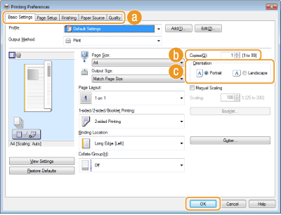 Norādiet drukāšanas iestatījumus, piemēram, eksemplāru skaitu un drukas orientāciju, un noklikšķiniet uz [OK] (Labi).