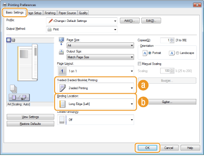 Norādiet pozīciju, kurā izdrukas tiks iesietas, izmantojot kādu iesiešanas rīku, piem., skavotāju. Drukāšanas orientācija tiks mainīta atkarībā no norādītās iesējuma pozīcijas. Lai norādītu iesējuma pozīcijas piemales platumu, noklikšķiniet uz [Gutter] (Iekšējā mala).