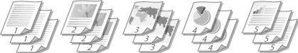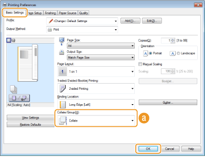 Drukājot vairākus vairāklappušu dokumentus, izvēlieties [Collate] (Kārtot komplektos), lai secīgi drukātu pilnus komplektus. Šī funkcija ir noderīga, lai sagatavotu izdales materiālus sapulcēm un prezentācijām.