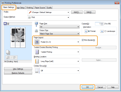 Plakāta formāta iestatījumus nevar izvēlēties, ja ir iespējota divpusējā drukāšana. Sadaļā [1-sided/2-sided/Booklet Printing] (Vienpusēja/divpusēja/brošūras drukāšana) izvēlieties [1-sided Printing] (Vienpusējā drukāšana) un pēc tam izvēlieties plakāta formāta iestatījumu.