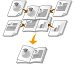 [Divide into Sets] (Sadalīt komplektos): tiek drukāti vairāki komplekti, kas sadalīti pēc sadaļā [Sheets per Set] (Lapas komplektā) norādītā lappušu skaita. Iesieniet katru komplektu un pēc tam savienojiet tos vienā brošūrā. Izvēlieties šo iespēju, ja dokumentā ir pārāk daudz lapu, lai tās visas iesietu vienā brošūrā.