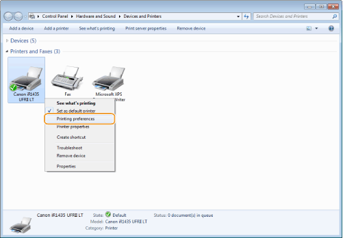 Ar peles labo pogu noklikšķiniet uz printera ikonas un noklikšķiniet uz [Printing preferences] (Drukāšanas preferences).