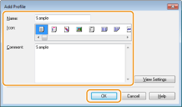 Ievadiet profila nosaukumu sadaļā [Name] (Nosaukums), izvēlieties ikonu un pēc tam noklikšķiniet uz [OK] (Labi).
