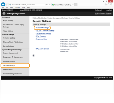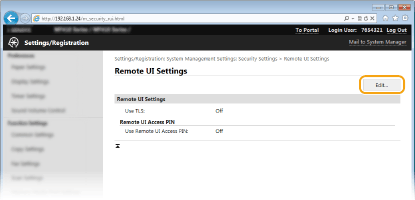 <Sistēmas pārvaldības iestatījumi> <Attālā interfeisa iestatījumi> <Attālā interf. piekļuves drošības iest.> <Iesl.> Ievadiet PIN <Lietot> Ievadiet PIN (apstipriniet) <Lietot> .Rīcība Remote UI (Attālais lietotāja interfeiss) iestatījumu inicializēšanas gadījumāŠādā gadījumā tiek inicializēts arī Remote UI (Attālais lietotāja interfeiss) PIN. Pēc atjaunošanas atiestatiet PIN. Izvēlnes inicializēšana