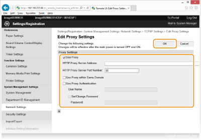 Ja ir aktivizēta starpniekservera autentifikācija, lai iestatītu vai mainītu tās paroli, atzīmējiet izvēles rūtiņu un kā jauno paroli tekstlodziņā [Password:] ievadiet maks. 24 burtciparu rakstzīmes.