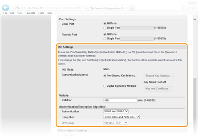Norādiet iestatījumus [Valid for:] un [Authentication:]/[Encryption:]/[DH Group:].