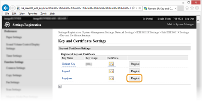 Varat skatīt detalizētu informāciju par sertifikātu vai pārbaudīt to, sadaļā [Key Name] noklikšķinot uz atbilstošās teksta saites vai sertifikāta ikonas. Atslēgu pāru un digitālo sertifikātu pārbaudīšana