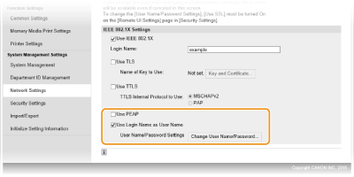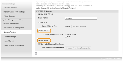 Nepieciešamie iestatījumi ir gandrīz tādi paši kā TTLS iestatījumi. MSCHAPv2 tiek izmantots kā iekšējs protokols. Pirms šīs autentifikācijas metodes konfigurēšanas iespējojiet utilītas Remote UI (Attālais lietotāja interfeiss) TLS (