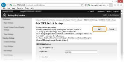 Iekārta un autentifikācijas serveris veic savstarpēju autentifikāciju, pārbaudot sertifikātus. Sertificēšanas iestādes (Certification Authority — CA) izsniegtais atslēgu pāris ir nepieciešams, lai autentificētu klientu (autentificējot iekārtu). Lai autentificētu serveri, papildus iekārtā sākotnēji instalētajam CA sertifikātam var izmantot to CA sertifikātu, kas tika instalēts, izmantojot Remote UI (Attālais lietotāja interfeiss). TLS metodi nevar vienlaikus izmantot ar TTLS vai PEAP.