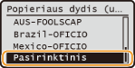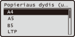 Jei įdėjus popieriaus anksčiau pavaizduotas ekranas nerodomasJeigu į universalųjį dėklą visuomet dedate tokį patį popierių, popieriaus nustatymo veiksmus galite praleisti įregistravę popieriaus formatą ir tipą kaip numatytąjį parametrą. Įregistravus numatytąjį parametrą, anksčiau pavaizduotas ekranas nerodomas. Jei norite matyti ekraną, <Išjungta> pasirinkite <Užreg. numatyt. param.> (Numatytųjų popieriaus parametrų priskyrimas universaliajam dėklui).