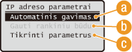 jei nenorite naudoti DHCP protokolo IP adresui priskirti Pasirinkite <Išjungta>. Pasirinkus <DHCP>, kai DHCP paslauga neprieinama, aparatas ieškos teikiamų paslaugų tinkle, todėl vyks nereikalinga komunikacija. |