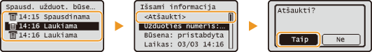Atšaukimas naudojant „Remote UI“ (Nuotolinio naudotojo sąsaja)Spausdinimą galite atšaukti iš „Remote UI“ (Nuotolinio naudotojo sąsaja) puslapio [Job Status]: Spausdinamų dokumentų esamos būsenos tikrinimas
