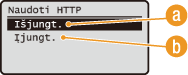 HTTP naudojamas tinklo ryšiams, pvz., kai pasiekiate aparatą naudodami priemonę „Remote UI“ (Nuotolinio vartotojo sąsaja). Jei naudojate USB jungtį arba nenaudojate HTTP, galite išjungti HTTP ir blokuoti kenkėjiškus trečiosios šalies įsibrovimus per nenaudojamą HTTP prievadą.