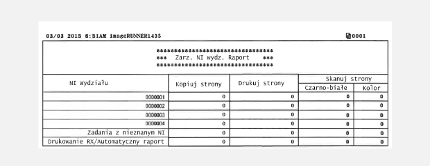 Gdy funkcja Zarządzania identyfikatorami wydziałów jest aktywna, możesz wydrukować raport, aby sprawdzić całkowitą liczbę stron, które zostały wydrukowane zgodnie z identyfikatorem wydziału. Raport umożliwia monitorowanie użycia i lepsze zarządzanie urządzeniem.