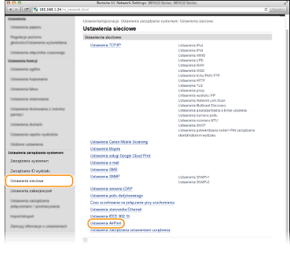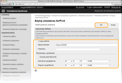 Możliwa jest rejestracja informacji, takich jak nazwa urządzenia oraz lokalizacja instalacji, które posłużą do identyfikacji urządzenia. Można również wyłączyć obsługę technologii AirPrint przez urządzenie. Aby zmienić te ustawienia, należy użyć Zdalnego interfejsu użytkownika.
