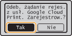 Istnieje także możliwość rejestracji urządzenia za pomocą urządzenia mobilnego lub przeglądarki Google Chrome*. Przed dokończeniem rejestracji na wyświetlaczu urządzenia widoczny jest poniższy ekran potwierdzenia. Naciśnij <Tak>, aby zakończyć rejestrację.