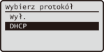 Aby adres IP nie był przypisywany za pomocą protokołu DHCP Wybierz <Wyłącz>. Jeżeli wybierzesz <DHCP> gdy usługa DHCP nie jest dostępna, urządzenie sprawdzi, czy sieć udostępnia te usługi. Może wówczas wystąpić niepotrzebna komunikacja. |