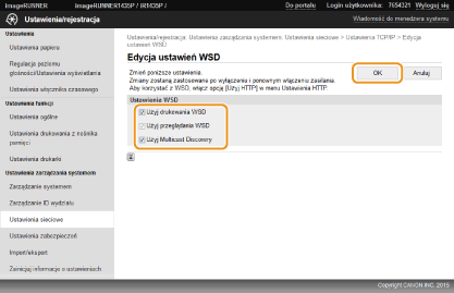 Zaznaczenie tego pola wyboru umożliwia uzyskanie informacji o urządzeniu przez komputer za pomocą interfejsu WSD. To pole wyboru jest zaznaczane automatycznie po zaznaczeniu pola wyboru [Użyj drukowania WSD]. [Użyj Multicast Discovery]