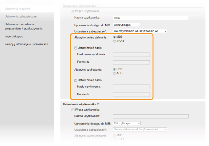 Ustawienia te trzeba określić, tylko jeśli wybrano opcję [Uwierzytelnianie wł./szyfrowanie wł.] lub [Uwierzytelnianie wł./szyfrowanie wył.] dla elementu [Ustawienia zabezpieczeń].