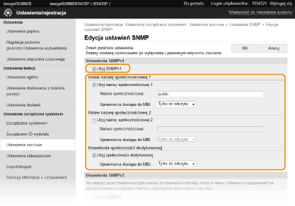 Jeśli włączone są obie wersje protokołu SNMP, zalecane jest wybranie w ustawieniach uprawnień dostępu do obiektów menedżera MIB dla protokołu SNMPv1 opcji [Tylko do odczytu]. Uprawnienia dostępu do obiektów menedżera MIB dla protokołów SNMPv1 i SNMPv3 można ustalać oddzielnie (a także osobno dla każdego użytkownika w przypadku protokołu SNMPv3). Wybranie opcji [Odczyt/zapis] (uprawnienie pełnego dostępu) dla protokołu SNMPv1 anuluje wydajne funkcje zabezpieczeń protokołu SNMPv3, ponieważ większością ustawień urządzenia można wtedy zarządzać za pomocą protokołu SNMPv1.