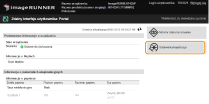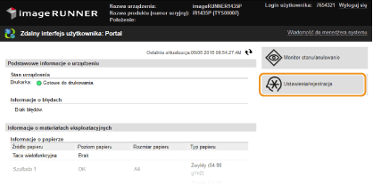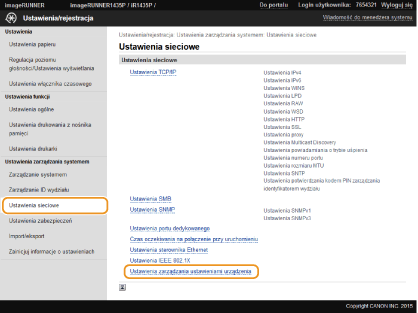 Można usprawnić pozyskiwanie różnych informacji o urządzeniach sieciowych i zarządzanie nimi dzięki wdrożeniu w sieci oprogramowania do zarządzania urządzeniami, takiego na przykład jak iW Management Console*. Informacje, takie jak ustawienia urządzenia oraz rejestry błędów są pobierane i rozpowszechniane za pośrednictwem serwera. Jeśli urządzenie jest podłączone do tego typu sieci, oprogramowanie zarządzające urządzeniem przeszukuje sieć w poszukiwaniu urządzenia za pomocą protokołów, takich jak Service Location Protocol (SLP) w celu pobrania od niego informacji. W poniższym rozdziale opisano procedury konfiguracji ustawień SLP oraz ustawień komunikacji pomiędzy urządzeniem a wtyczkami dla iW Management Console. Te ustawienia można skonfigurować za pomocą Zdalnego interfejsu użytkownika.