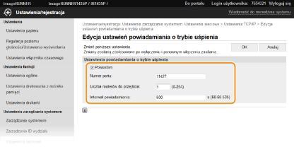 Zaznaczenie tego pola wyboru umożliwia powiadamianie oprogramowania do zarządzania urządzeniami o stanie zasilania urządzenia. Zaznaczenie opcji [Powiadom] pozwala na uniknięcie nawiązywania przez urządzenie zbędnej komunikacji w trybie uśpienia i zmniejszenie całkowitego zużycia energii. [Numer portu:]