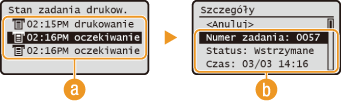 .![]() <Rejestr zad. druk.>Wyświetlanie listy dokumentów, które zostały wydrukowane. <OK> jest wyświetlane po pomyślnym wydrukowaniu dokumentu. Jeżeli natomiast drukowanie dokumentu nie powiedzie się, ponieważ zostało anulowane lub wystąpił błąd, na ekranie pojawi się komunikat <Błąd>.