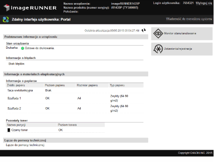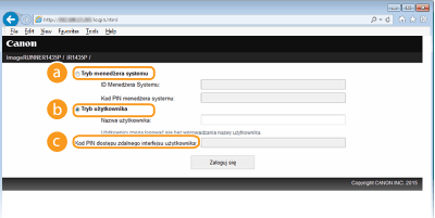 Pozwala wykonywać wszystkie operacje i konfigurować wszystkie ustawienia w Zdalnym interfejsie użytkownika. Wprowadź poprawny identyfikator w polu [ID Menedżera Systemu:] oraz PIN w [Kod PIN menedżera systemu:] (
