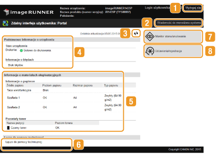 Wyświetla bieżący stan urządzenia i informacje o błędach. W przypadku wystąpienia błędu wyświetlana jest strona Informacje o błędzie [Informacje o błędach].
