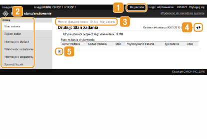 Wyświetla stan aktualnie drukowanych dokumentów oraz historię wydruków. Umożliwia także sprawdzenie stanu urządzenia.