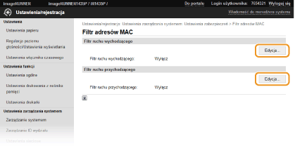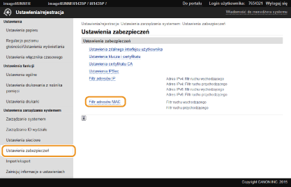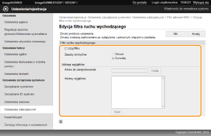 Sprawdzanie poprawności adresów Nieprawidłowo wprowadzone adresy MAC mogą uniemożliwić dostęp do urządzenia z poziomu Zdalnego interfejsu użytkownika. Konieczne będzie wtedy ustawienie filtra <Filtr adresów MAC> na wartość <Wyłącz>. Filtr adresów MAC