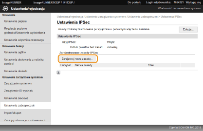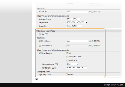 Aby włączyć funkcję uwierzytelniania z użyciem protokołu ESP, wybierz opcję [SHA1] dla algorytmu hashowania. Wybór opcji [Nie używaj] oznacza wyłączenie funkcji uwierzytelniania z użyciem protokołu ESP.